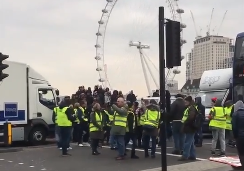 A small group of some 40 to 60 ‘Yellow vest’ protesters, dressed in similar fashion to the ones seen in France over the past three weeks, have this morning started blocking London’s famous Westminster Bridge.