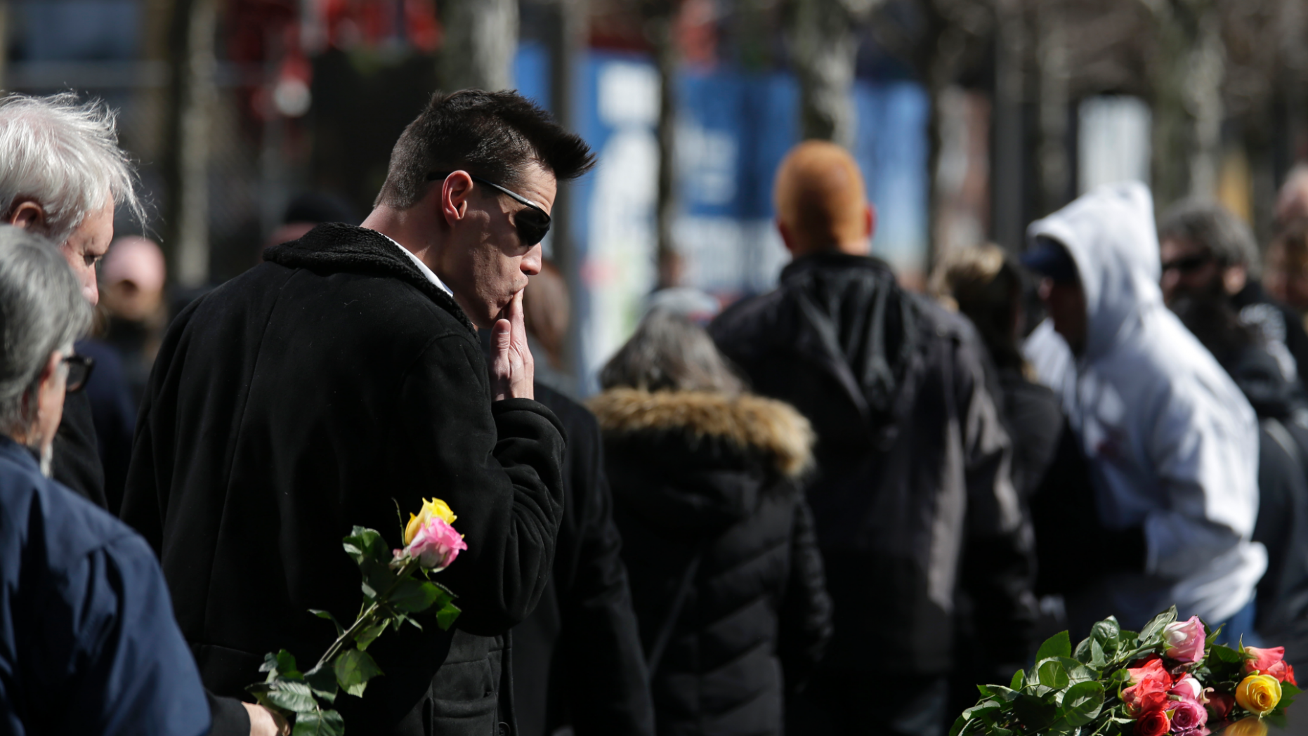 People place flowers over the names of the victims of the 1993 World Trade Center bombing during a ceremony at the 9/11 Memorial in New York, Tuesday, Feb. 26, 2019. (AP Photo/Seth Wenig)