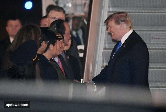 He shook hands with dignitaries on a red carpet that was flanked by members of the Vietnamese armed forces dressed in crisp white uniforms. The route to his hotel was decorated with American, North Korean and Vietnamese flags, and adults and children peered out upper floor windows holding up cellphones to capture Trump’s arrival.