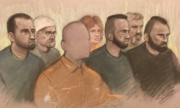 An artist’s sketch of the man, who cannot be named, and his co-defendants at Worcester crown court. Photograph: Elizabeth Cook/PA