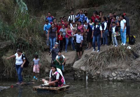 Venezuelan children in school uniforms boarded makeshift wooden rafts to cross the Tachira River on Wednesday to reach schools in Cucuta, Colombia.