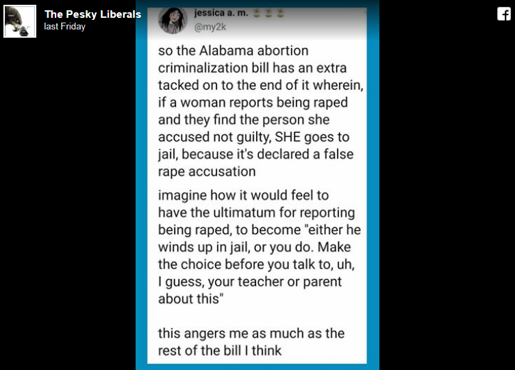 An image shared on the Facebook page The Pesky Liberals claimed that an abortion bill in Alabama “has an extra tacked on to the end of it wherein, if a woman reports being raped and they find the person she accused not guilty, SHE goes to jail, because it’s declared a false rape accusation.”