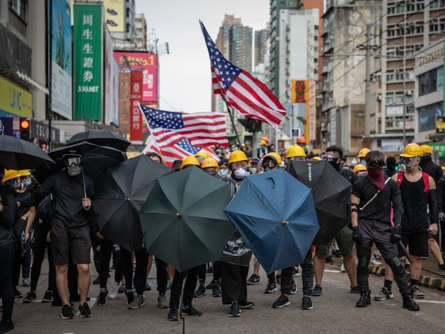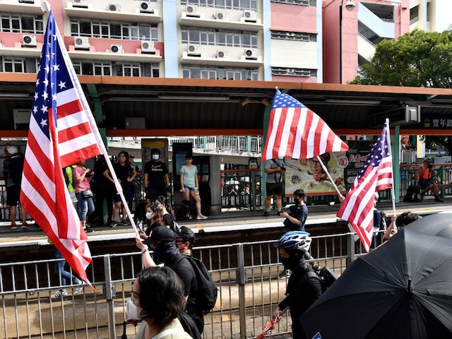 This weekend was not the first time the American flag surfaced as a symbol against Chinese tyranny. Pro-democracy protesters prominently waved the flag a week ago in the city center: