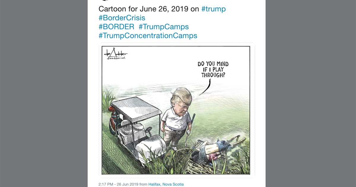 The cartoon by Michael de Adder, shows a golf-attire clad Trump, standing next to a golf cart and looking down on the bodies of two drowned migrants with the caption, “Do you mind if I play through?”