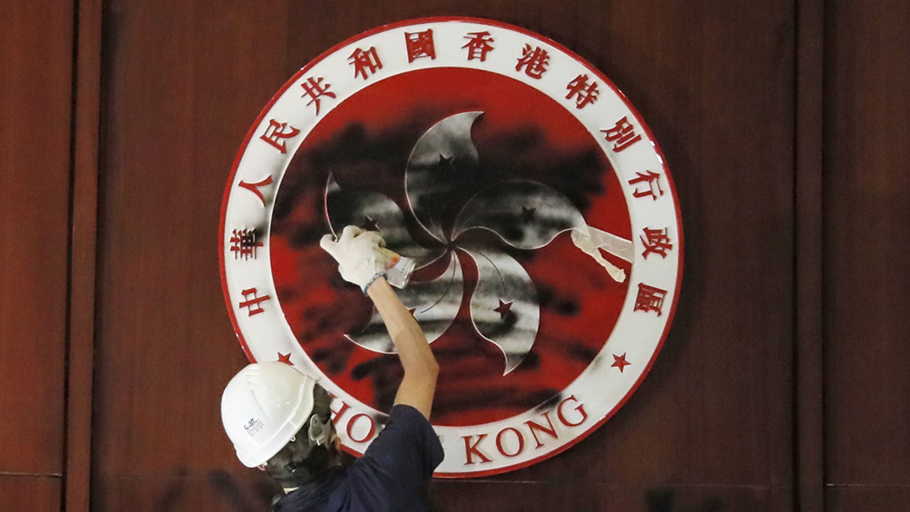 Protesters spray-painted over the emblem, covering the portion which read “People’s Republic of China”, only leaving Hong Kong’s section on the emblem unscathed.