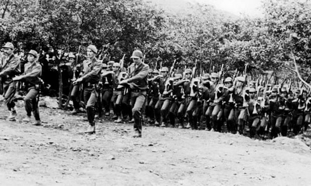 Picture taken in the 60s of Revolutionary Armed Forces of Colombia (Farc) fighters training at a camp somewhere in the Colombian mountains. Photograph: –/AFP