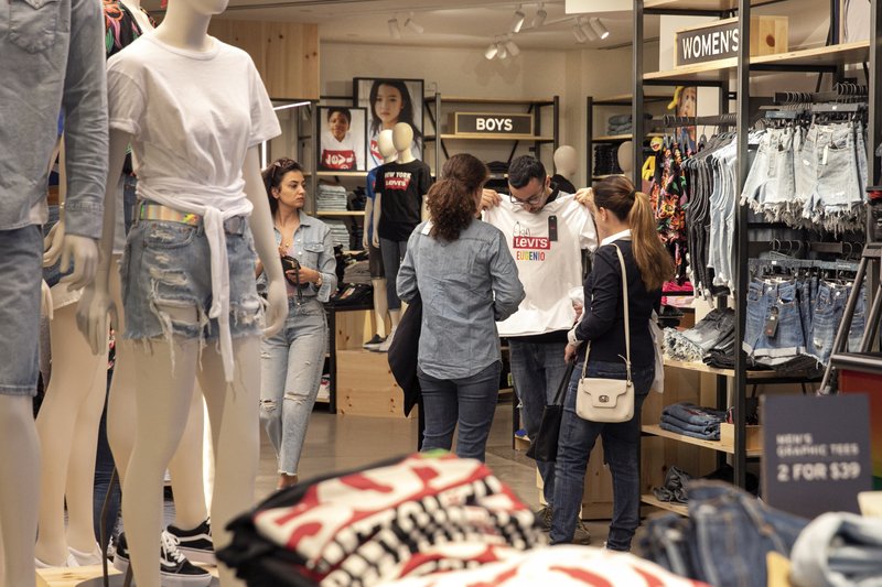 FILE – In this June 14, 2019, file photo a customer shows off his personalized Levi’s tee shirt in the Levi’s store, in New York’s Times Square. (AP Photo/Richard Drew, File)