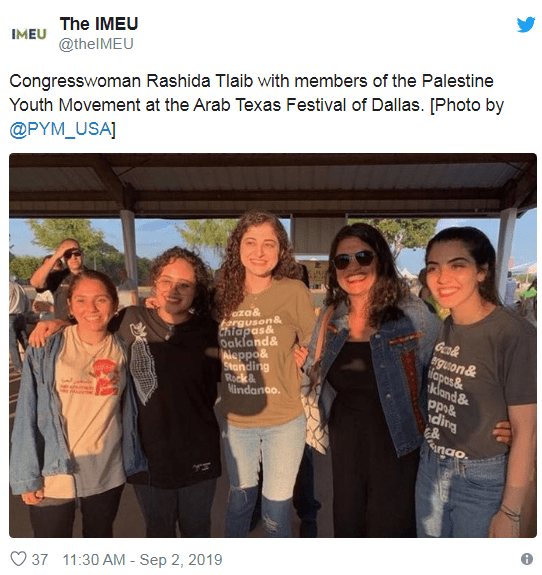 Tlaib, who has been under fire for her hatred of Israel and support for the anti-Semitic Boycott, Divestment, and Sanctions movement was pictured meeting with members of the Palestine Youth Movement during the Arab Texas Festival held recently in Dallas.