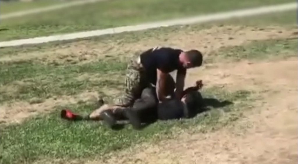 A video shows a Marine, who was on Edison High School’s campus to help with military recruitment, sprinting toward two students mid-brawl and tackling the pair to the ground.