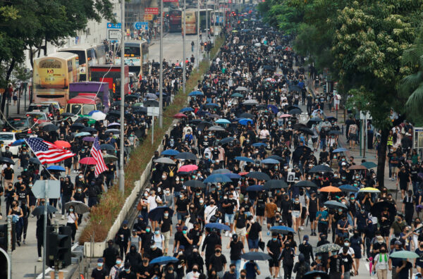 Pro-democracy demonstrators march in protest against a ban on face masks made under emergency laws in Hong Kong, China, Oct. 12, 2019. (Reuters/Umit Bektas)