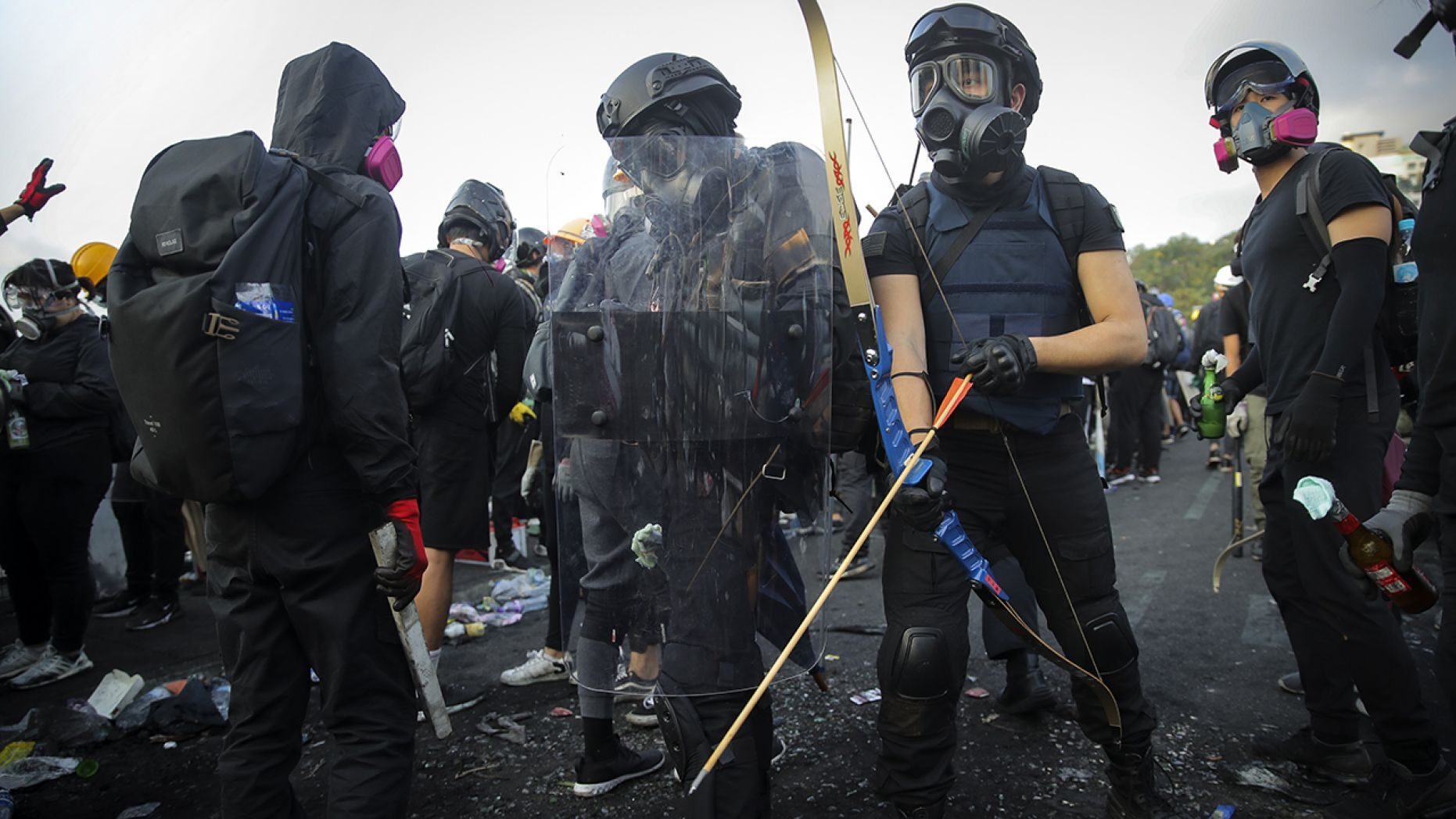 Students wielded homemade gear and weapons outside the Chinese University of Hong Kong on Wednesday. (AP Photo/Kin Cheung)