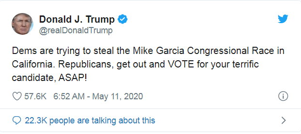 “Dems are trying to steal the Mike Garcia Congressional Race in California,” Trump tweeted Monday morning, echoing the NRCC memo. “Republicans, get out and VOTE for your terrific candidate, ASAP!”