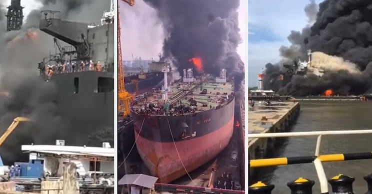 Flying an Indonesian flag, the 250-meters-long (roughly 820-foot-long), 21-year-old Aframax-class crude oil tanker caught fire during repair efforts in the shipyard, which reportedly spread to a second nearby vessel.