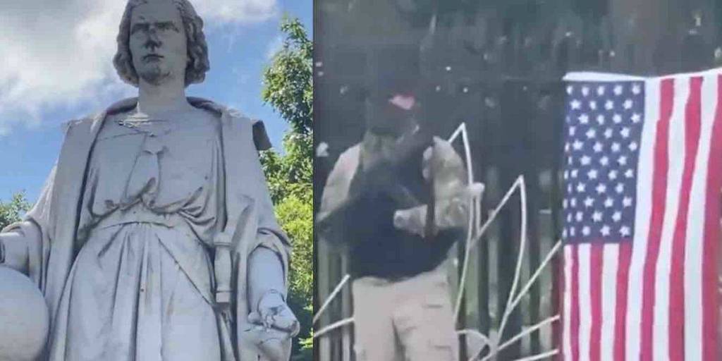 They then smashed the statue with what appears to be a sledgehammer or an axe.