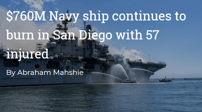 ‘A TERRIBLE TRAGEDY’: “We suffered a terrible tragedy aboard USS Bonhomme Richard (LHD 6) when a fire broke out aboard the ship while in port San Diego,” tweeted Chief of Naval Operations Adm. Mike Gilday in a statement last night.