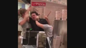 The scuffle sent pizza slices flying at one point and the combatants nearly knocked over the cash register as the patron was being pummeled.