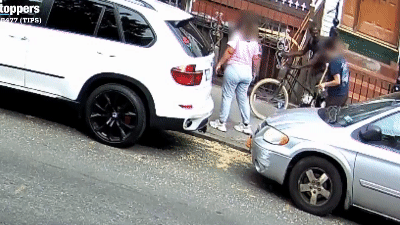 The incident unfolded in Flushing on Tuesday at around 9:35 a.m., the New York Police Department said on Twitter. Video shows a man on a bike approaching two women as one of the women walked a dog in the borough.