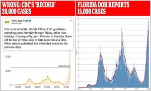 On Wednesday, the CDC updated Florida’s new cases to 23,958 for Friday, 21,487 on Saturday and 19,584 on Sunday – quietly admitting that the state DOH was right – but did not offer an explanation as to why.