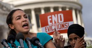 Ocasio-Cortez joined Democrats at a news conference on Tuesday to call for passage of a bill granting the Biden administration the authority to implement an eviction moratorium.