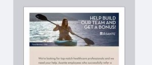 The image shows a young woman in a canoe on a lake, with the logo, “Help build our team and get a bonus!” and it’s signed “Asante.”