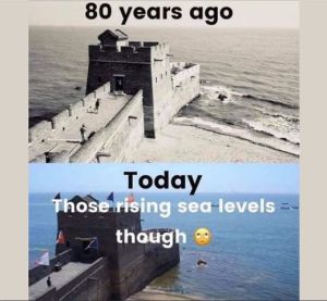 The Facebook post appears to show two images, one in black and white and the other in color, both showing what appears to be a formidable stone wall that extends into the sea. The black and white image is labeled with text that reads, “80 years ago,” while the bottom photo includes text that reads, “Today: Those rising sea levels though.” In both images, the sea level appears to be the same.