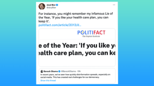 In response to one of Obama’s tweets about disinformation, conservative writer Jeryl Bier tweeted a screenshot of a Politifact article which called Obama’s infamous healthcare line the “Lie of The Year.”