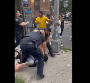 Bystanders can be seen in the video confronting the officers. One man in a yellow shirt appears to walk toward and officer, with both raising their fists at each other. It was unclear whether anyone was hit.