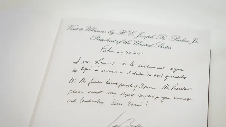 President Biden left a handwritten message for Ukrainian President Volodymyr Zelenskyy when he visited the Ukraine Royal Palace on Monday.