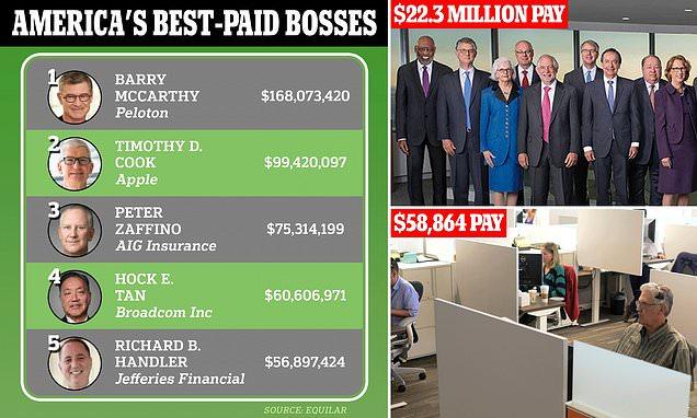 The top earners overall were Barry McCarthy, who took over the money-losing exercise bike maker Peloton last year, with a $168 million package, and Apple’s Tim Cook, who nets close to $100 million.