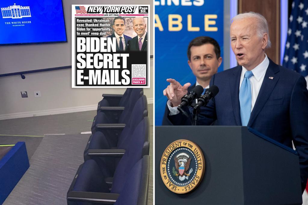 Biden, who falsely characterized The Post’s reporting as Russian disinformation, appeared with Transportation Secretary Pete Buttigieg to talk about airline policies in the White House-adjacent Eisenhower Executive Office Building.