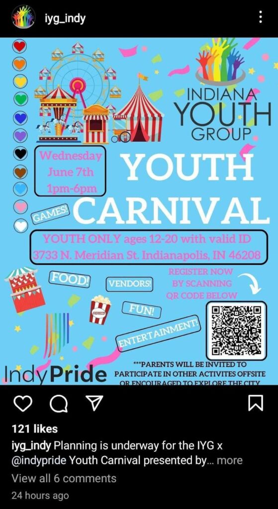 According to an Instagram post by Indiana Youth Group, it is collaborating with IndyPride to hold the carnival for “youth” ages 12 to 20 at an activity center nicknamed “The Pit” on June 7 from 1 to 6 p.m.