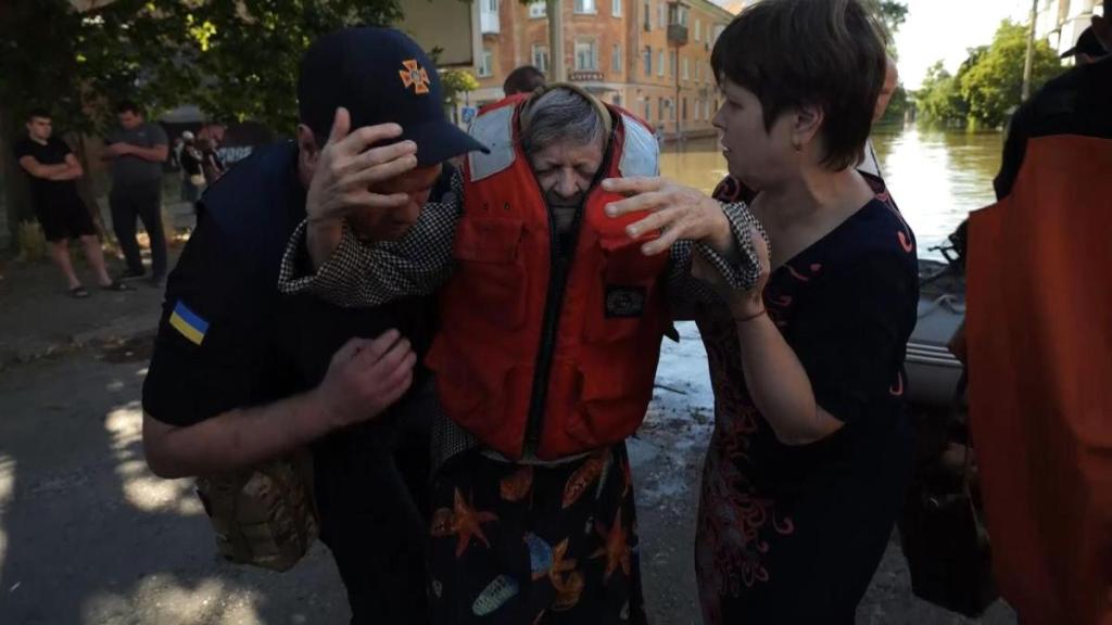 Elderly Ukrainians weep after escaping floodwaters and Russian fire