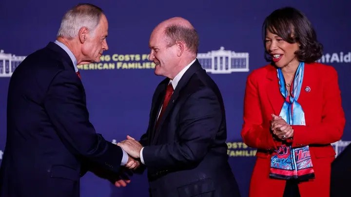Delaware Sens. Tom Carper and Sen. Chris Coons shake hands near Rep. Lisa Blunt Rochester before President Biden’s remarks on student debt at Delaware State University, Oct. 21, 2022 in Dover. (Anna Moneymaker/Getty Images)