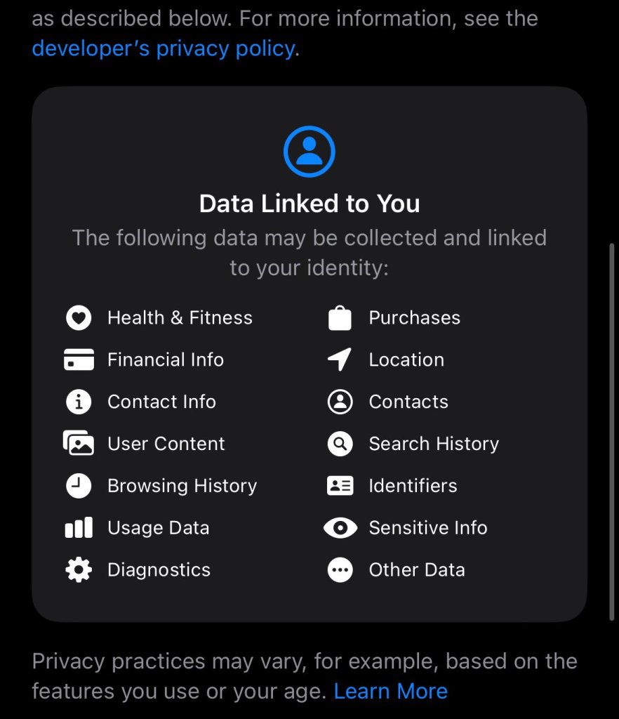 Screenshots of the app, which is available for pre-download on the App Store, shows it will collect data on users’ health & fitness, financial information, contact information, user content, browsing history, usage data, diagnostics, purchases, location, contacts, search history, identifiers, sensitive info, and more.