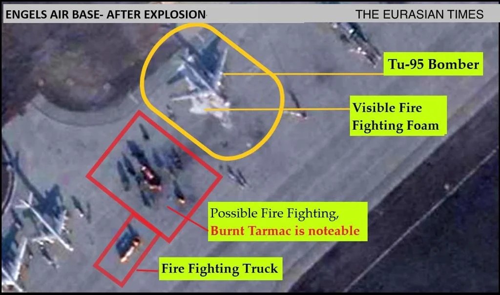 Now, another set of visuals posted on social media indicates that a Tu-22M3 strategic bomber was struck by the drone allegedly belonging to the Ukrainian military. The pictures first surfaced on Telegram and have subsequently spread to other social media sites.