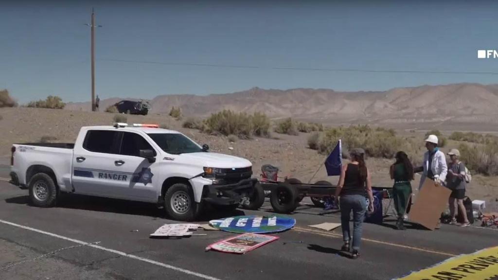 Moment Nevada Rangers plow truck through Extinction Rebellion protest