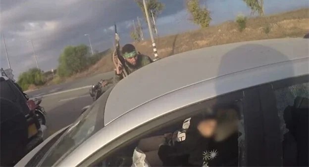 A Hamas terrorist approaches an Israeli vehicle. Credit: IDF and Times of Israel