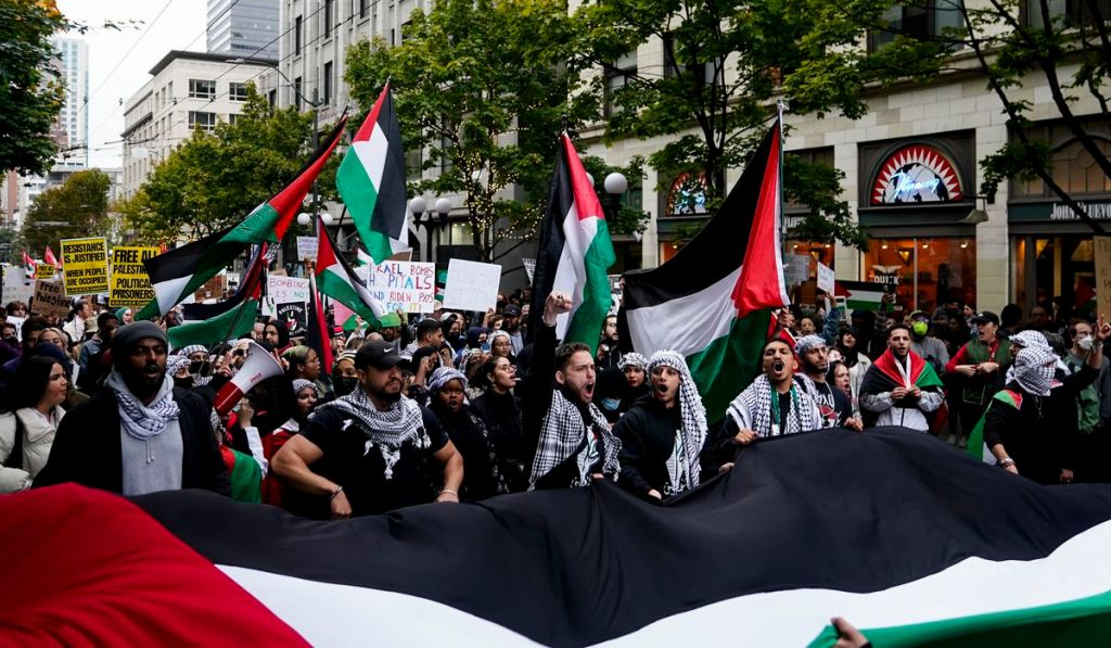 Marchers hold a large Palestinian flag as thousands march during a pro-Palestinian rally and march Saturday, Oct. 21, 2023, in Seattle. (AP Photo/Lindsey Wasson)