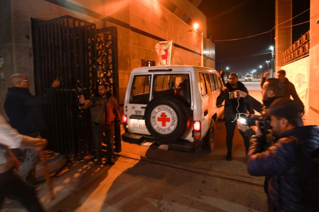 Video footage showed large groups of people in Gaza watching the first hostages as they were loaded into Red Cross SUVs, many recording on their phones.