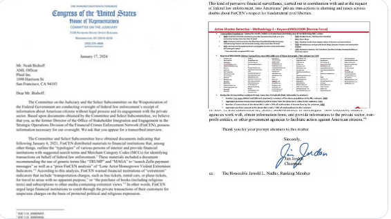 The letter from the Select Subcommittee on the Weaponization of Government and the Committee on the Judiciary have obtained documents indicating that following January 6, 2021, the Financial Crimes Enforcement Network (FinCEN) “distributed materials to financial institutions that, among other things, outline the ‘typologies’ of various persons of interest and provide financial institutions with suggested search terms and Merchant Category Codes (MCCs) for identifying transactions on behalf of federal law enforcement.”