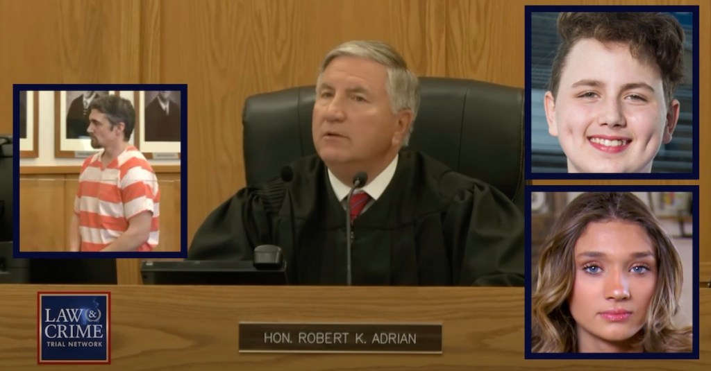 Tim Bliefnick (via Law&Crime). Center: Judge Robert K. Adrian (via Law&Crime). Inset top right: Drew Clinton (Quincy High School). Inset bottom right: Cameron Vaughan (Inside Edition/screengrab)