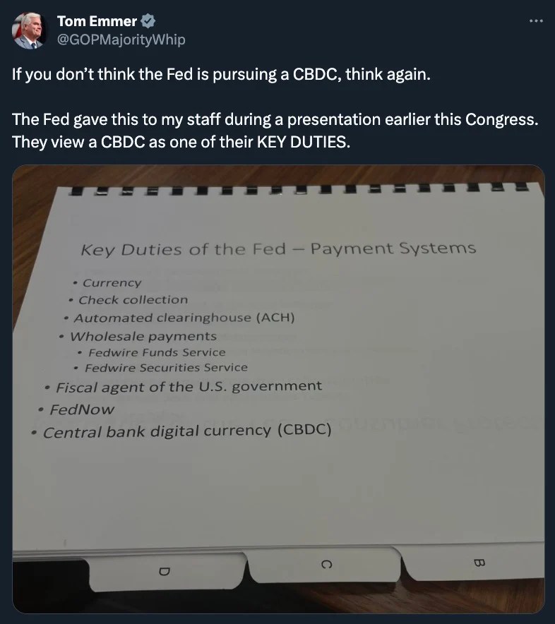 This is according to Congressman Tom Emmer, who posted a document on X on March 14, explaining that his office received it as the Fed representatives were in Congress for a presentation.