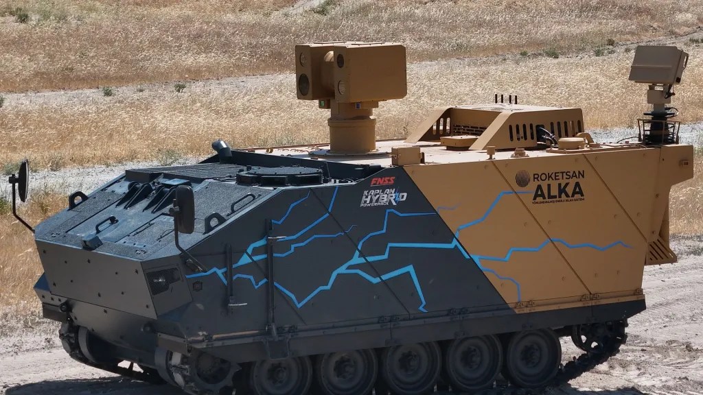The system is a joint venture between two of Turkey’s premier defense contractors: FNSS and ROKETSAN. FNSS developed the vehicle platform — the KAPLAN HYBRID — while ROKETSAN supplied the ALKA Directed Energy Weapon System (DEWS), which sits atop the chassis.