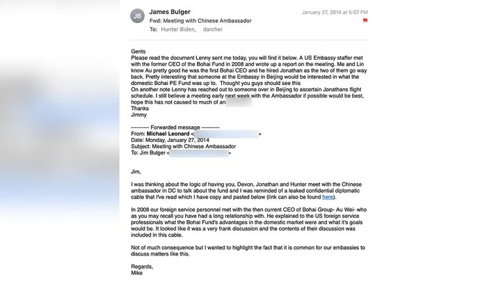 One email, dated Jan. 27, 2014, with the subject line: “Meeting with Chinese Ambassador,” shows Bulger suggesting himself, Hunter Biden, and his Rosemont Seneca co-founder Devon Archer, “meet with the Chinese ambassador in DC to talk about the fund.”