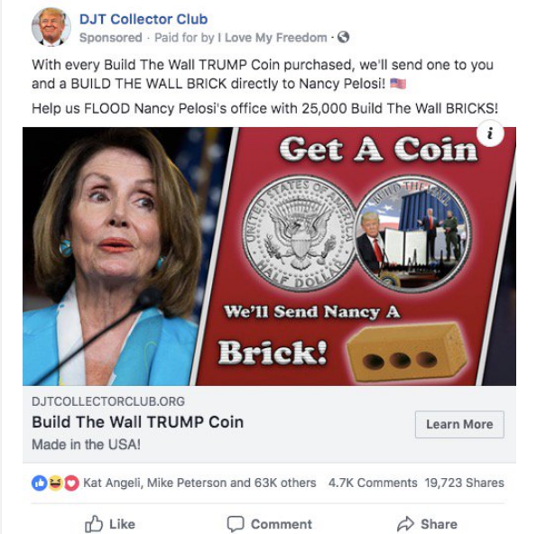 To raise money for the 2020 race, the Trump campaign is asking donors to chip in $20.20 for each fake brick, which will be sent to the Democratic congressional leaders amid the fight that underlies the extended partial government shutdown.