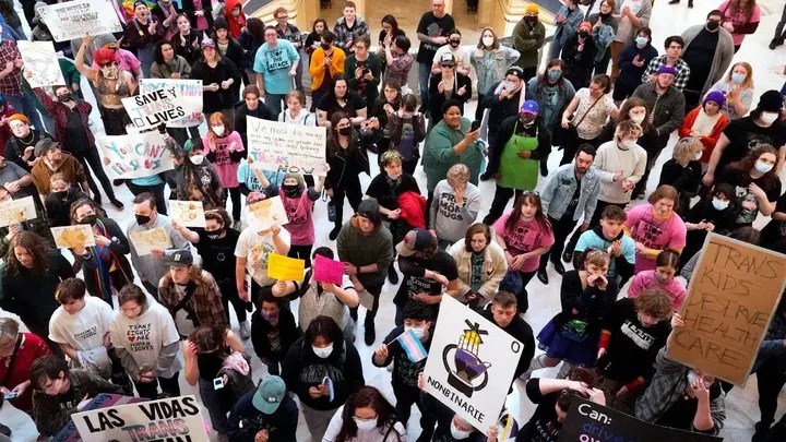 The demonstrators were protesting against Senate Bill 129, or the Millstone Act, which would prohibit Oklahoma doctors from providing gender transition procedures or referral services relating to such procedures to individuals younger than 26.