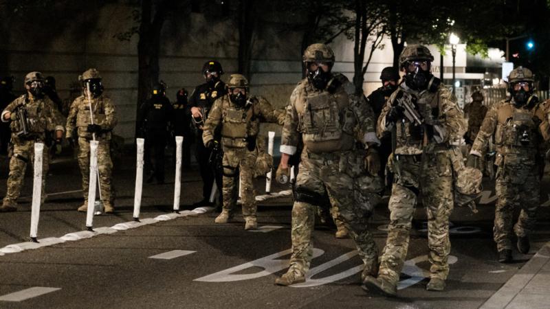 Federal officers prepare to disperse the crowd of protesters outside the Multnomah County Justice Center on July 17 in Portland. The use of federal agents has only made a bad situation worse, state and local officials told NPR.