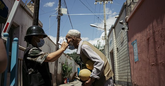 A Uighur man at a temperature checkpoint in Kuqa, China, on June 29, 2020.