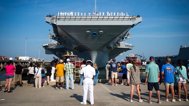 The Ford is the first in the Navy’s new class of advanced aircraft carriers, which are designed to carry a wider variety of planes and operate with several hundred fewer sailors. Nearly 4,500 sailors departed Tuesday in a strike group that includes guided-missile destroyers and several squadrons of fighter jets.