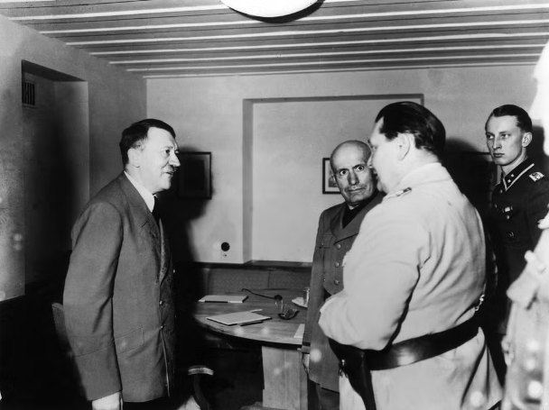 ullstein bild Dtl.//Getty Images. Benito Mussolini meets with Adolf Hitler and Hermann Göring at the Wolfsschanze in 1944.